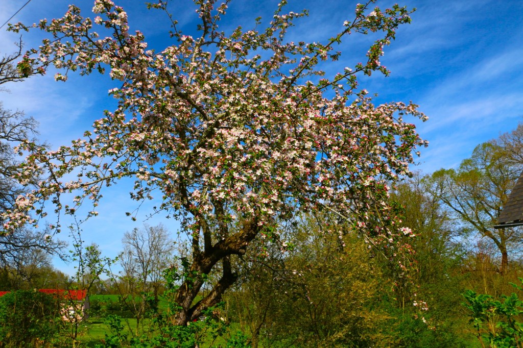 Ja, ik ben hier wel op mijn plek. Zo ’s ochtends vroeg om een uur of 8 tijdens de wandeling met de Evert. De frisse wat vochtige lucht, een beetje dampig nog. Die ene merel die altijd in die ene boom hoog zit te zingen. Trouwens, het hele vogeltjesconcert. Het bospad dat opeens vol ligt met kleine gele bolletjes, een soort besjes van de bloemen uit de boom erboven. Omdat het gisteren nogal waaide, of woei. De kleine gele en witte bloemetjes overal langs het pad en steeds meer rose, en paars ook. Het hele fijne frisse ogenschijnlijk kwetsbare groen van de blaadjes aan de bomen wat steeds dichter wordt. Zodat je de lijntjes van de takken steeds minder ziet. Ieder keer is er weer wat anders wat mijn aandacht trekt. De marter die wegschiet over het pad, de boom in. Net voordat Evert hem ziet. Maar hij ruikt hem wel. Soms de witte kontjes van enkele reetjes. Helemaal fijn als Evert dat niet ziet. De geweldige appelboom naast onze grange die nu zo mooi afsteekt tegen de blauwe lucht maar die wel hele vieze zure appels geeft. En dan zijn er nog de steeds groter groeiende fruitboompjes, sommige al bomen, in de tuin beneden. Het voelt allemaal zo heel erg als thuis. Ik hoor hier nu, Wij horen hier nu.