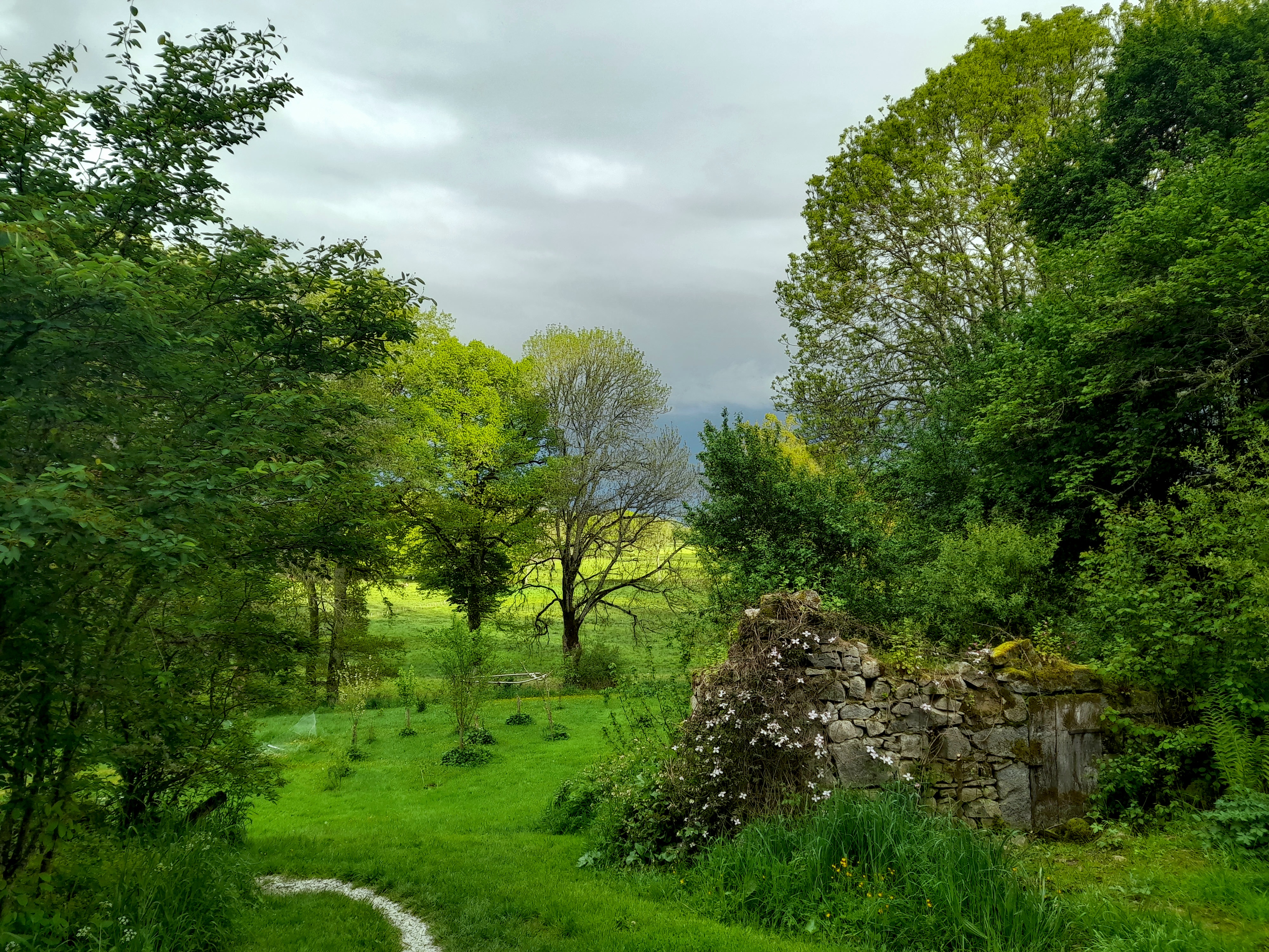 Ja, veel mooie luchten de laatste weken, het combineert mooi met het enorme, bijna lichtgevende groen. Daar valt ook weleens wat uit, uit die luchten. Regen, veel regen, heel veel en vaak regen. Vandaar dat het zo mooi groen is!