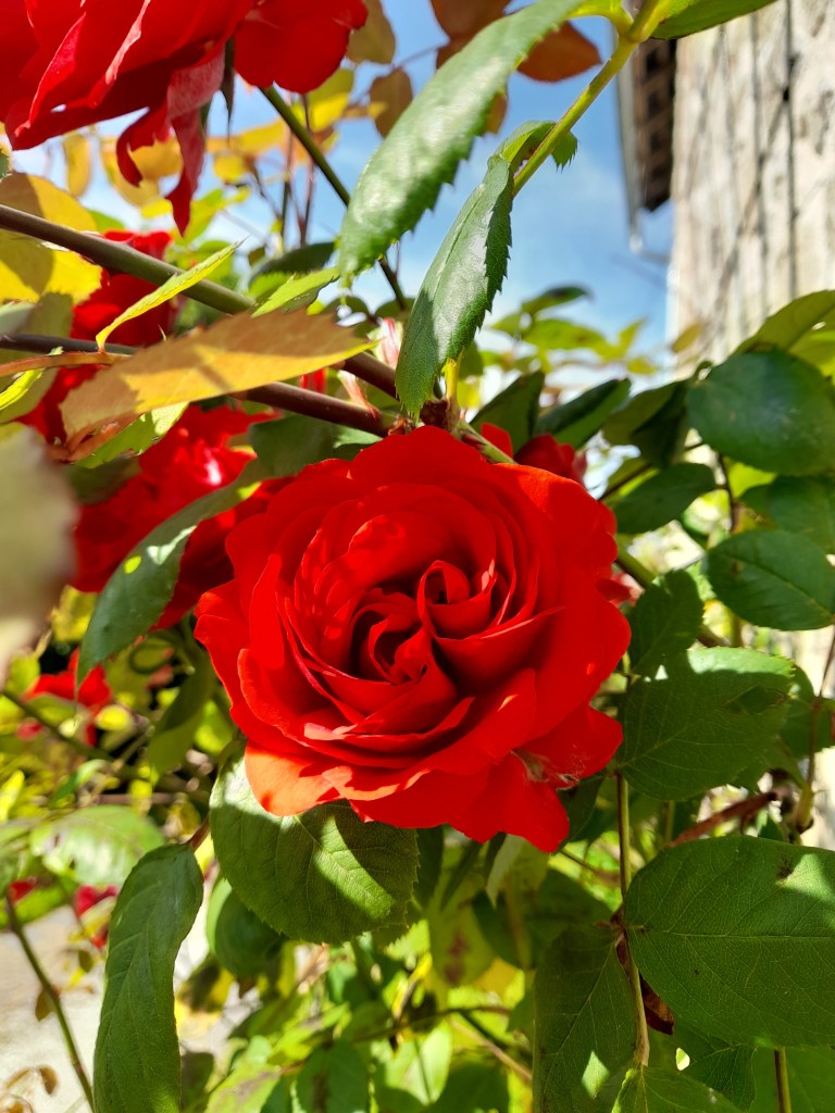 Tja, wat een mooie roos hè! Nadat alle rozen voor ons huis als het ware mishandeld zijn geweest vorig jaar tijdens het voegen van de voorgevel, zeg; naar voren omgebogen en ongewild zijn bestrooid met voegkruim, zijn ze er prachtig uitgekomen. Tussen de buien door waren ze soms prachtig. Je hoort het al, ook hier is het nog steeds geen zomer. Soms, een enkele dag, zoals gisteren, konden we zelfs, ja écht, buiten eten ’s avonds! En dat is dan puur genieten.
