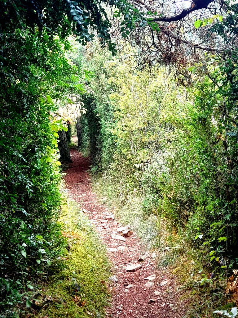 En nu over dat tegenkomen van mezelf. Om zo alleen in de Cevennen te lopen, (dat is een enorm woud), over smalle paadjes, vol met dikke keien, takken, stammen, andere zooi uit het woud en dan ook nog flink naar beneden dat is best wel spannend. Zoekend naar de rood-witte vlaggetjes. Ik voelde me nietig en kwetsbaar. Stel dat ik val op die scherpe keien. Of me enkel verstuik ofzo. Daar dacht ik wel aan. Wolven of zwijnen, daar was ik niet bang voor, die zijn daar ook. Sterker nog, ik ben gek op zwijnen. Maar goed, die smalle, slecht beloopbare paadjes…….ik was een keer aan het eind van de etappe in de Cevennen en wist niet precies hoe lang het nog was. Ik was moe van al dat gedaal tussen de keien en ik wilde niet meer, maar ik moest. Ik dacht aan me man, ik wilde even tegen hem aan leunen. Toen heb ik maar een boom gepakt, een eik, geen van Eijk dus maar eentje die daar een beetje op leek. Dus ik heb die boom omhelst en ben er tegenaan gaan leunen en heb ‘ns flink gehuild…….Het heeft geholpen en ik kon schoon weer verder naar de herberg waar ik zou slapen.