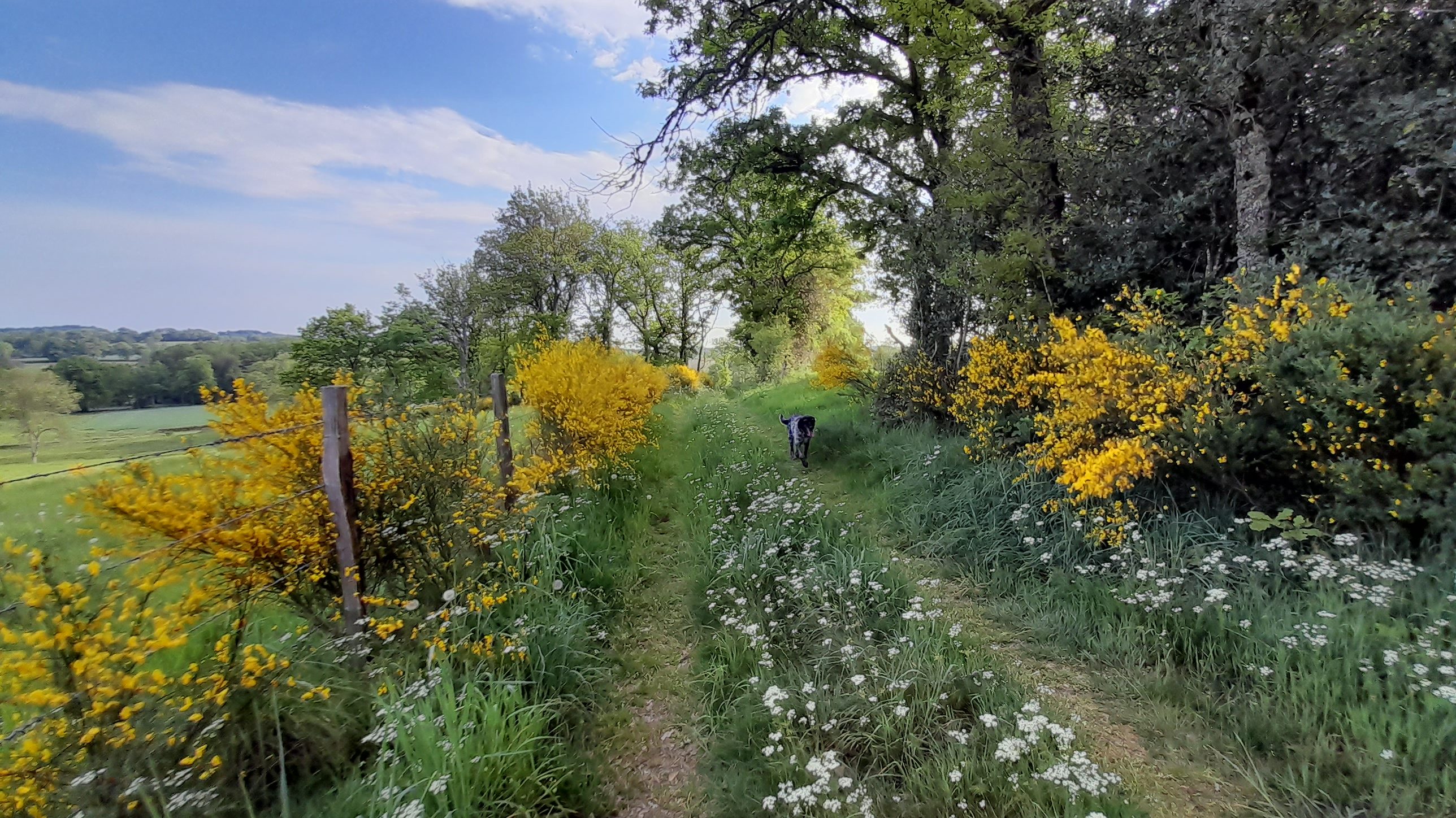Het gras is bijna té groen, er zijn weer volop paardenbloemen. En ook brandnetels. Madeliefjes. Als ik een stukje het bos in loop zie ik witte sterachtige bloemetjes, rose bloemetjes met harige stelen, paarse lage gezellige bloempjes. Dikke vette gele dotterbloemen op de natte stukken. Er is weer kleur. En geluid. Van de vogeltjes, gefluit,…